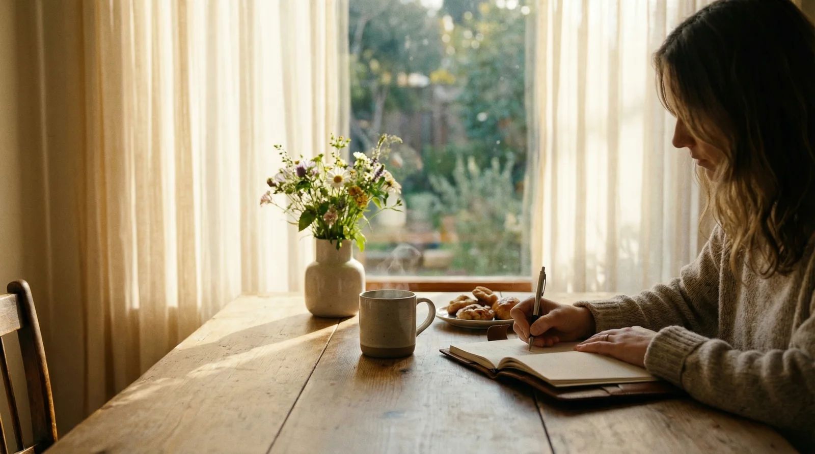 "5-Minute Morning Journal" — 5 guided prompts, 5 minutes, at your own pace. All you need is a notebook and a pen.